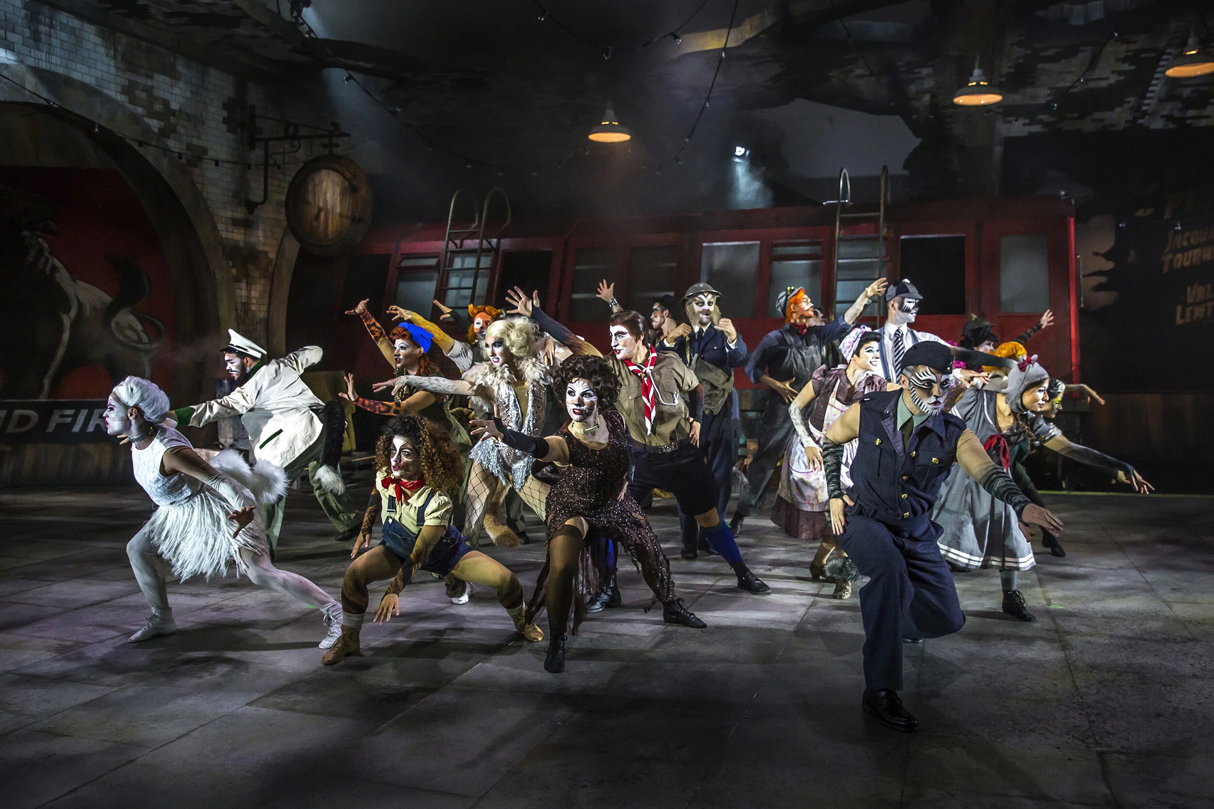 “T S Eliot’s ‘Old Possum’s Book of Practical Cats’, upon which the show is based, was published in 1939. Fitting then, that Philip Witcomb’s set design beautifully evokes wartime London. We are thrust into the murky world of a dilapidated underground station with a derailed tube carriage centre stage, around which the cats slink and slide. It’s a stunning backdrop to the expertly choreographed dance routines which are performed with energy and precision throughout. The personalities of the different cats are more distinct than in previous productions I’ve seen, helped by wonderful costume design (Philip Witcomb, again). In place of the more traditional leotards, we have a host of characters including a woolly tank-topped schoolboy, a milkman, an engine driver, a neckerchiefed scout and a wing commander. The effect is to create a real sense of a ‘cat community’ – these felines are pulling together in a time of national crisis.”