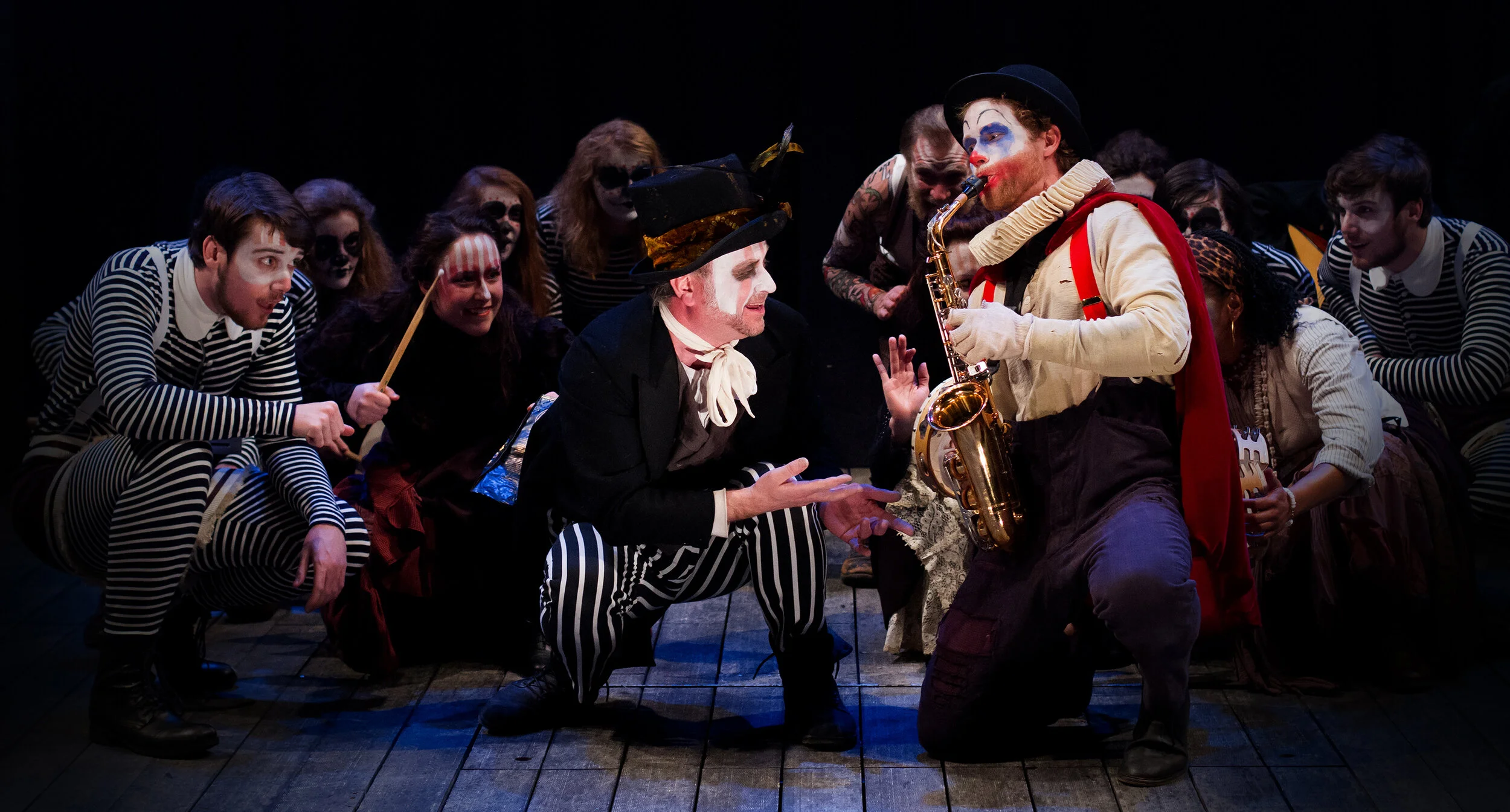 Witcomb's costume design parallels these motifs - a band of players celebrating the seasons and their transformative power - almost exactly: at the pre-show festivities, some of the actors have donned their characters' costumes, but others are dressed specifically for that event, with many of the dancers donning jackets made of fluttering red and white ribbons. The troupe's baseline seems to be a slightly twisted circus aesthetic, featuring a lot of black and white stripes, tattoo sleeves, and Victorian silhouettes, but paired with wild teased hair and stylized face paint, including some designs clearly inspired by the Mexican Day of the Dead festival. In the play itself, wintery Sicilia requires the addition of heavy coats and furs; in springtime Bohemia, meanwhile, the dress is in fact more bohemian, with skirts and trousers rolled up and topped with a variety of outlandish accessories, including more flowers and animal masks for the sheep-shearing festival."