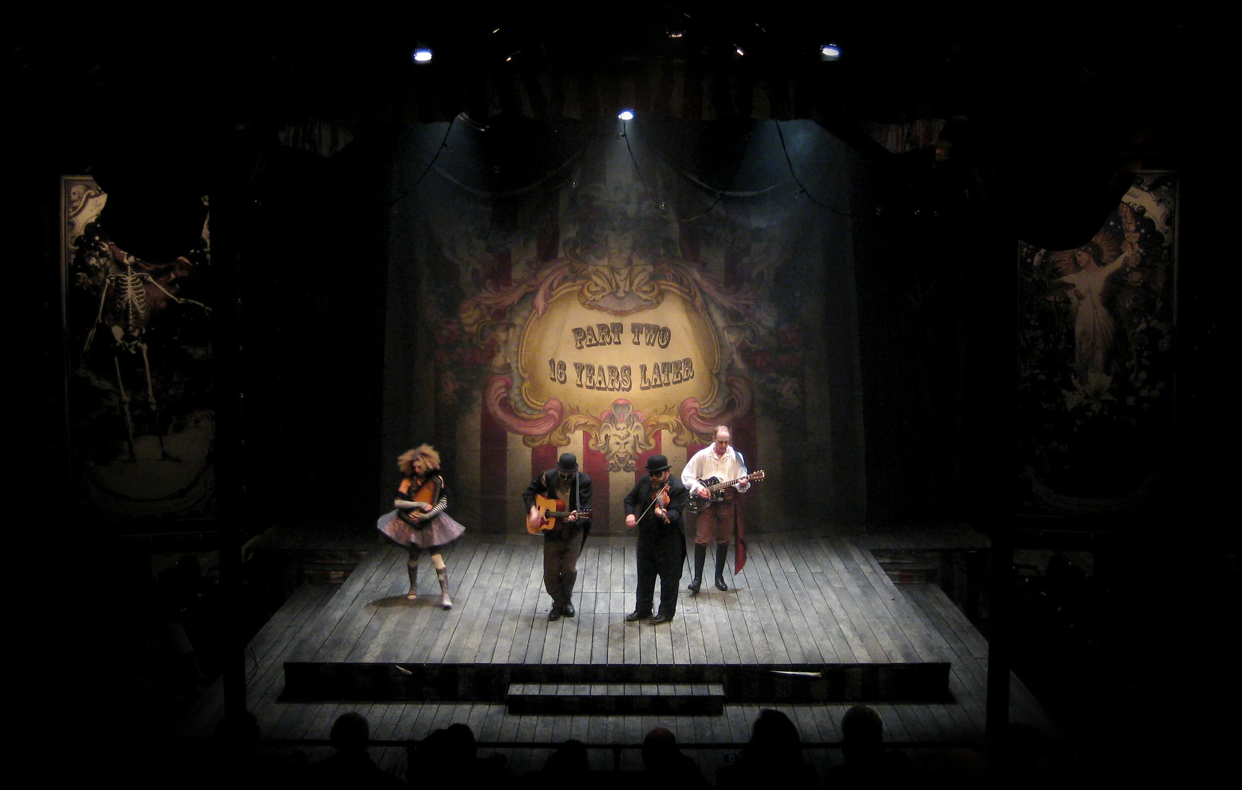 "Outside the main entrance, surrounded by the stoves and underneath the lanterns, is a weathered wooden structure acting as a stage for the entertainers, laid out like the grounds at a small country fair. Costume/Set Designer Philip Witcomb continues this association inside with a thrust stage constructed of the same gray wood, lined with battered red and white bunting and old-timey gazebo lights. Modern technology is disguised, as the speakers have been replaced by phonograph horns and the stage lights given retro limelight covers. Flanking the stage are two giant posters in the style of old woodcuts: on the left, a skeleton cavorts in a bleak landscape under In Mortem Brumalis, and on the right, a maiden is surrounded by greenery underneath Die Natalis Aestas; roughly, "In the death of winter to the birthday of summer". Just in case the theme of the festival isn't yet clear, the set dressing features a literal progression of the seasons: Sicilia, soon-to-be site of brutality and cold-heartedness, is decked out like a winter hunting lodge with antlers, animal skulls, and an enormous bear's head and holly wreath; Bohemia, source of renewal and rebirth, changes out those fixtures for stuffed lambs and garlands of flowers.